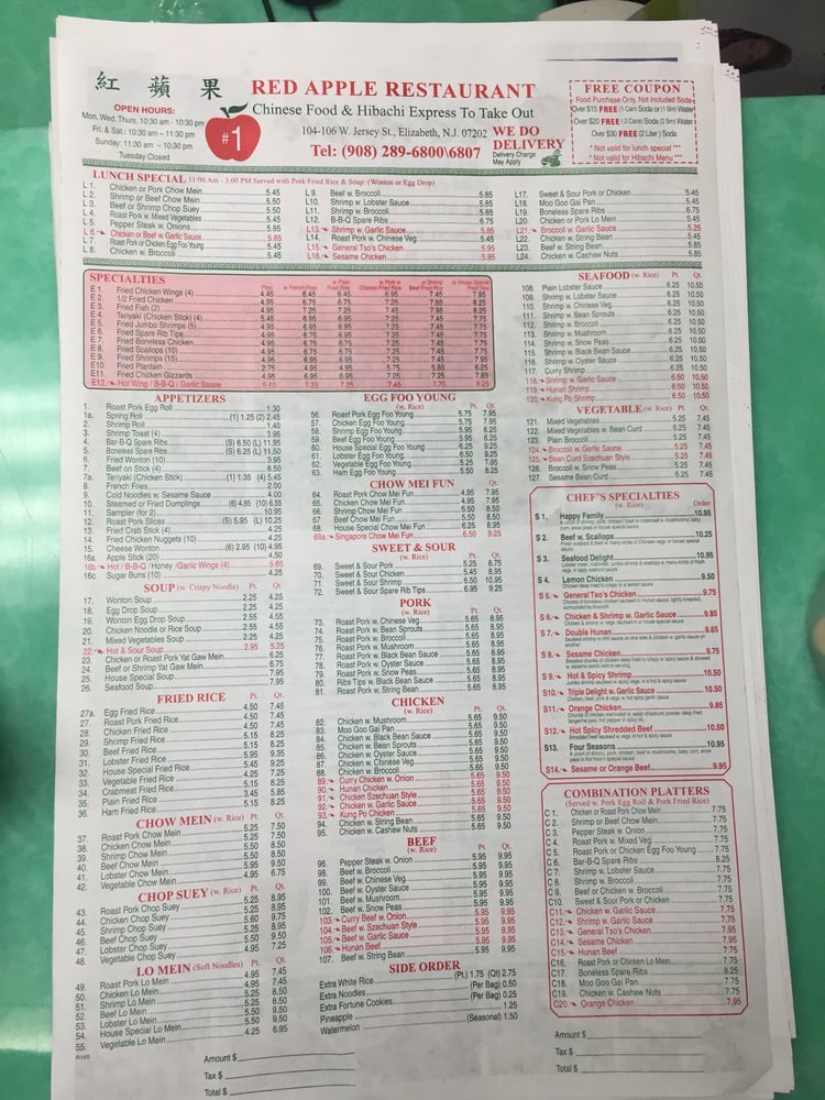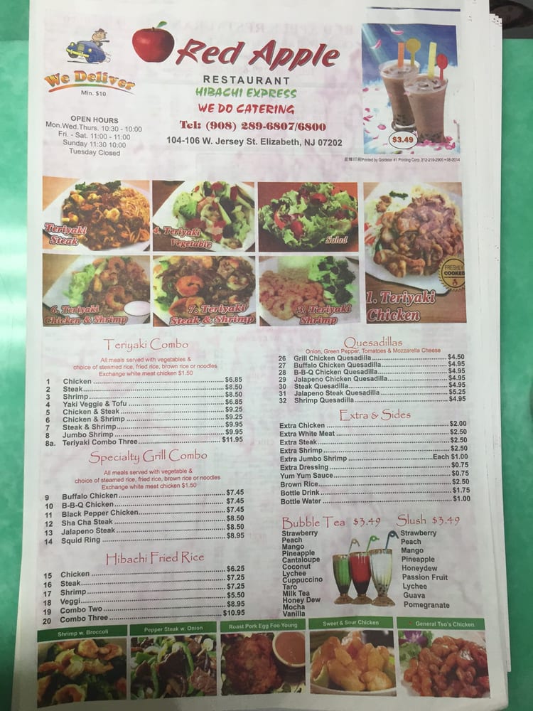 Red Apple in Elizabeth, NJ offers a wide range of Chinese cuisine with options for delivery, takeout, reservations, and catering. They have a variety of appetizers like steamed or fried dumplings, buffalo wings, and boneless spare ribs. The menu also includes soups like hot and sour soup and wonton soup, as well as fried rice dishes including house special fried rice and shrimp fried rice. Customers have praised Red Apple for their delicious sesame chicken, garlic sauce, and pork fried rice. The restaurant has received positive reviews for their fast delivery and friendly service. With a blend of traditional Chinese takeout and a hibachi grill, Red Apple provides a unique dining experience that keeps customers coming back for more.